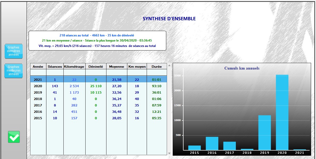 Et cette année 2020 (8284 km) maudite à la suite du COVID-19 ! Deux confinements suivis à la lettre ! Ne me feront pas passer la barre des 10000 km en une année, bis repetita en 2021 (6825 km) en espérant que 2022 me le permettras mais cela reste une autre histoire, À suivre…